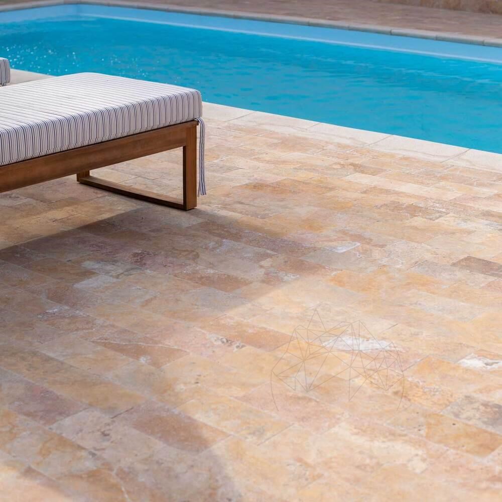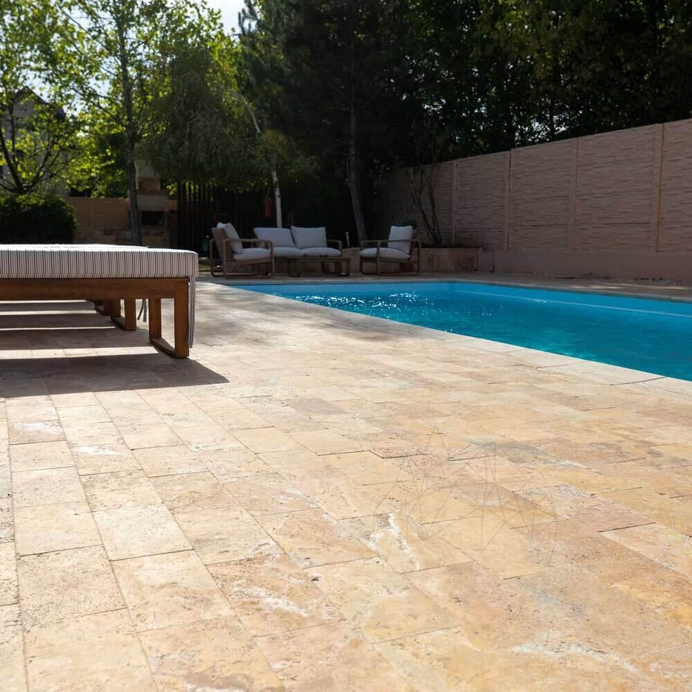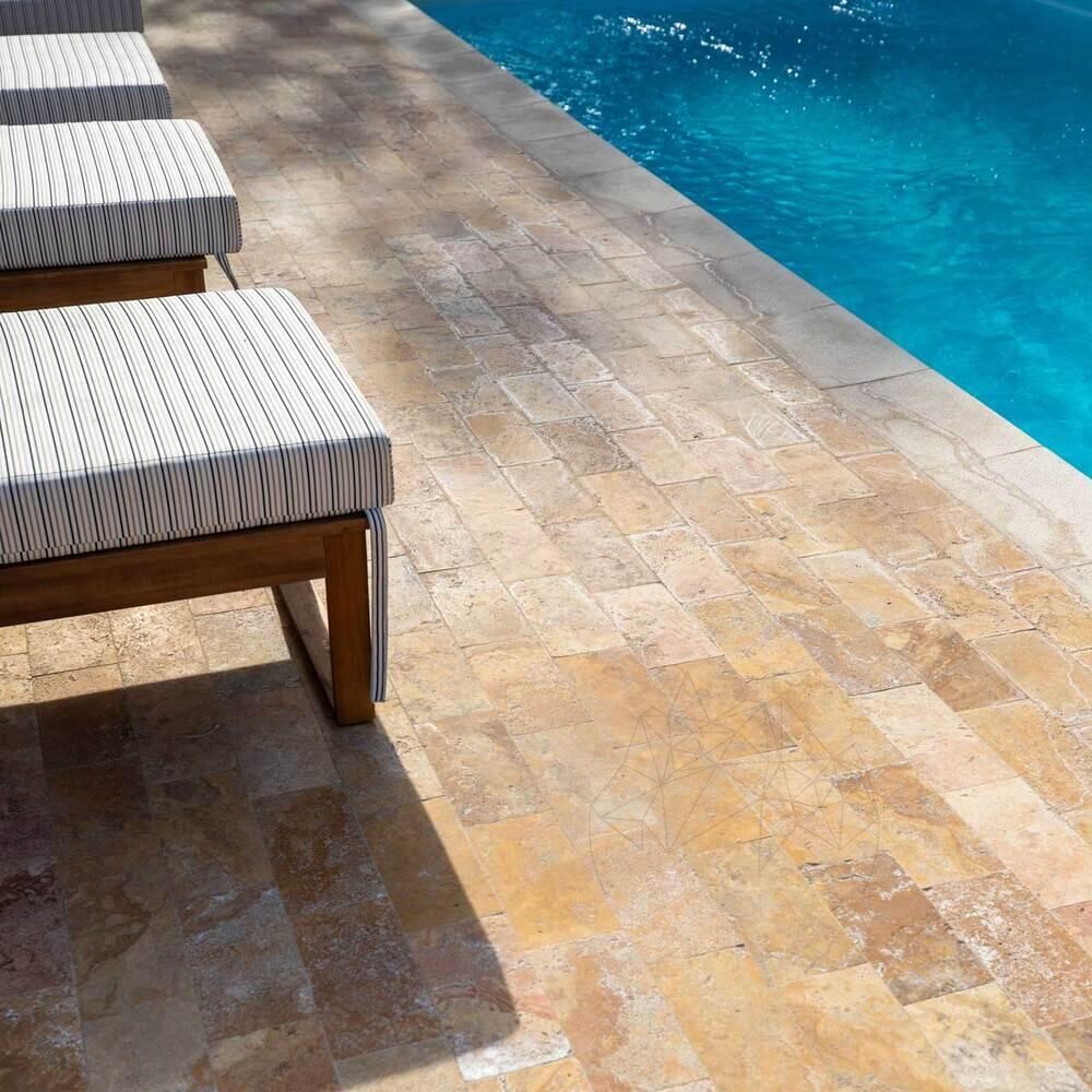 Pavajul exprima nu doar o armonizare cu mediul inconjurator, ci si o marca a personalitatii fiecaruia. Noua gama de pavaj din travertin Yellow Cross Cut antichizat cu grosimea de 3 cm, indeplineste cu succes acest rol. Recomandat pentru spatii exterioare cu trafic mediu, acest produs rezistent impresioneaza prin culoare si textura atunci cand este folosit la realizarea aleilor pietonale, a parcarilor si chiar a centurilor din jurul piscinelor. Datorita dimensiunilor placilor (30.5 x 15.2 x 3 cm), travertinul Yellow Cross Cut cu finisaj antichizat poate fi montat in diferite aranjamente, care pot crea modele atractive, ingenioase, puse in valoare prin varietatea cromatica a fiecarei placi in parte. De exemplu, se poate asorta armonios cu o casa placata cu travertin in nuante diferite (Classic, Latte, Yellow etc.). Desi cel mai adesea pavajul din travertin Yellow Cross Cut este utilizat in amenajari de tip mediteraneean sau rustic, acesta se potriveste si constructiilor cu tenta eleganta, clasica, pentru ca potentialul acestui produs consta intr-o combinatie unica de rafinament si jovialitate.
