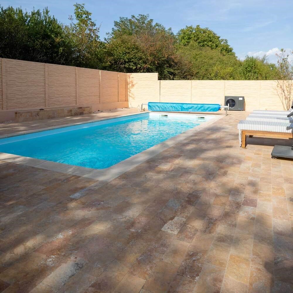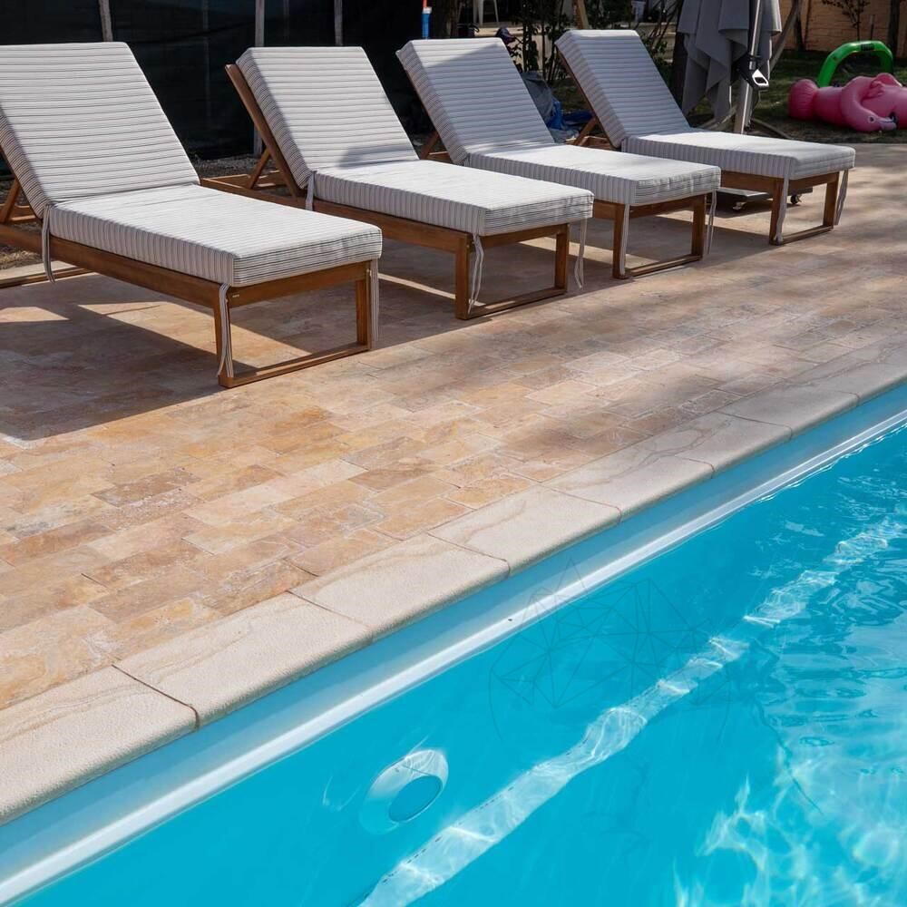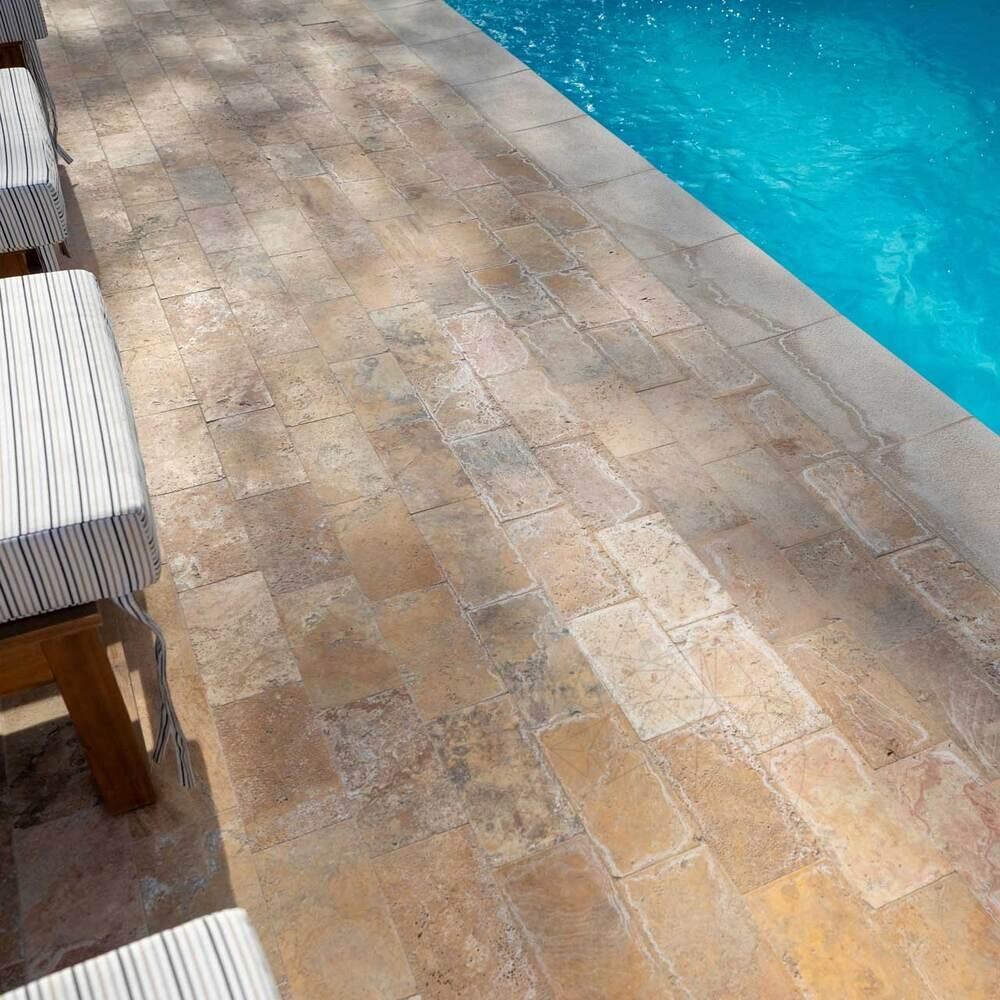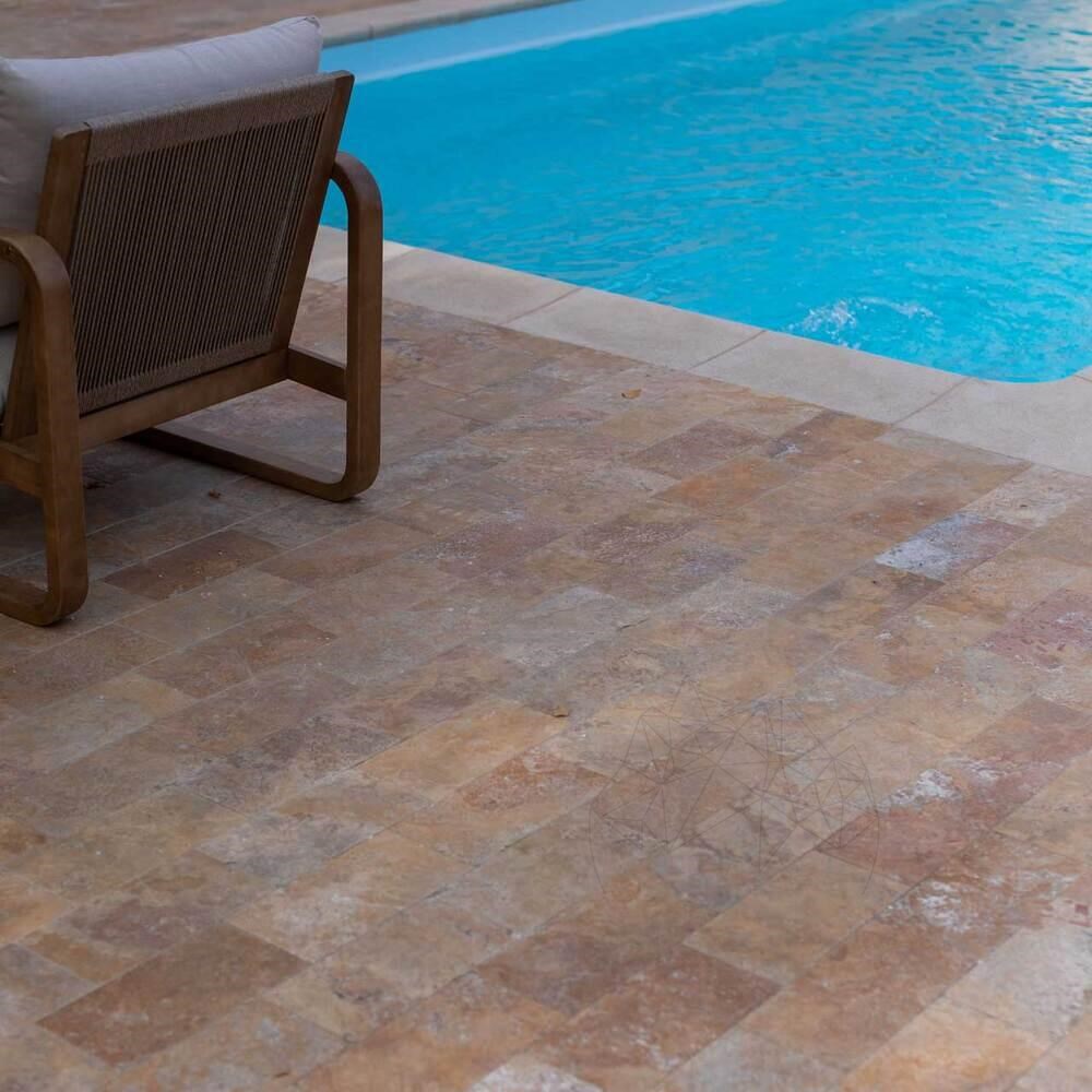 Pavajul exprima nu doar o armonizare cu mediul inconjurator, ci si o marca a personalitatii fiecaruia. Noua gama de pavaj din travertin Yellow Cross Cut antichizat cu grosimea de 3 cm, indeplineste cu succes acest rol. Recomandat pentru spatii exterioare cu trafic mediu, acest produs rezistent impresioneaza prin culoare si textura atunci cand este folosit la realizarea aleilor pietonale, a parcarilor si chiar a centurilor din jurul piscinelor. Datorita dimensiunilor placilor (30.5 x 15.2 x 3 cm), travertinul Yellow Cross Cut cu finisaj antichizat poate fi montat in diferite aranjamente, care pot crea modele atractive, ingenioase, puse in valoare prin varietatea cromatica a fiecarei placi in parte. De exemplu, se poate asorta armonios cu o casa placata cu travertin in nuante diferite (Classic, Latte, Yellow etc.). Desi cel mai adesea pavajul din travertin Yellow Cross Cut este utilizat in amenajari de tip mediteraneean sau rustic, acesta se potriveste si constructiilor cu tenta eleganta, clasica, pentru ca potentialul acestui produs consta intr-o combinatie unica de rafinament si jovialitate.