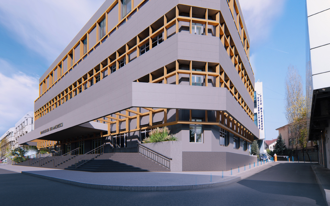 ”Conceptul a avut in vedere extinderea si reamenajarea cladirii existente, formate din parter si doua niveluri. S-a urmarit integrarea a doua niveluri de spatii multifunctionale, amfiteatre, sali de curs, spatii de foyer si circulatie peste cladirea existenta. Abordarea propusa este moderna, transparenta, respectand mediul si cerintele in eficienta energetica. Concret, o structura metalica, similara unei cutii, a fost proiectata, plasata si ancorata peste constructia existenta. Design-ul interior a fost conceput ca un spatiu industrial de tehnologie inalta ce comunica cu alte spatii organice. Amfiteatre suplimentare, laboratoare, sali de clasa, sali de conferinta au fost proiectate si finisate cu materiale de cea mai buna calitate. Noua extindere a cladirii este vizibila si din exterior, contribuind la imaginea zonei construite. Ca fiecare lucrare, si aceasta are povestea ei iar, in cazul de fata, avem in vedere ca, initial, structura cladirii a fost realizata anterior anilor 1990, pentru un ”circ al foamei” din timpul comunismului, structura extrem de solida si bine realizata, gandita de la bun inceput pentru incarcari foarte mari.